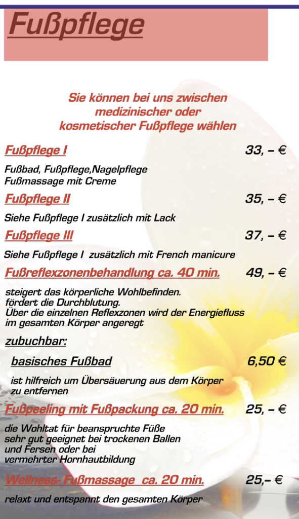 Für gepflegte Hände und Füße: Unsere professionellen Fußpflege- und Maniküre-Behandlungen sorgen für gesunde Nägel, Wohlbefinden und ein rundum gepflegtes Erscheinungsbild.